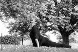 Relaxed middle aged plus size Caucasian woman performing the Upward Facing Dog yoga on a mat on green grass in park, exemplifying health and flexibility. Sport activity for wellbeing, mental health.