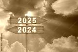 An image with a signpost pointing in two different directions in German. One direction points to 2024, the other points to 2025. Future Business concept ideas.