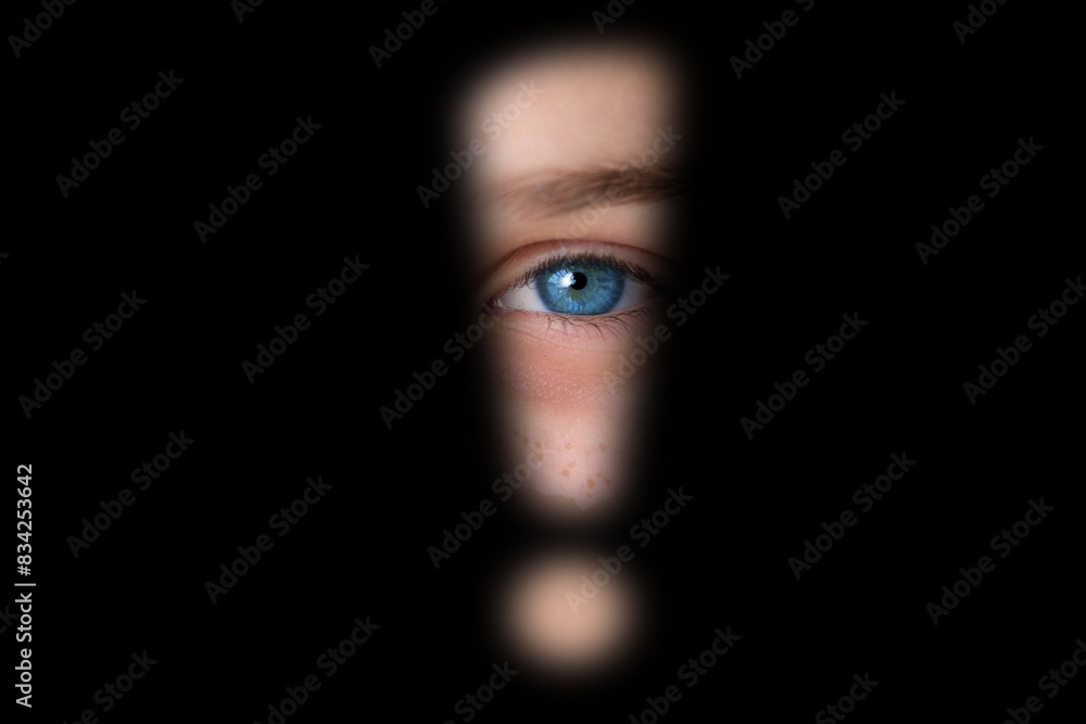 close-up of part of face, serious eye looking through hole exclamation point in dark, concept of seeing scary, stress problems, domestic violence, difficult childhood, problems of growing up children