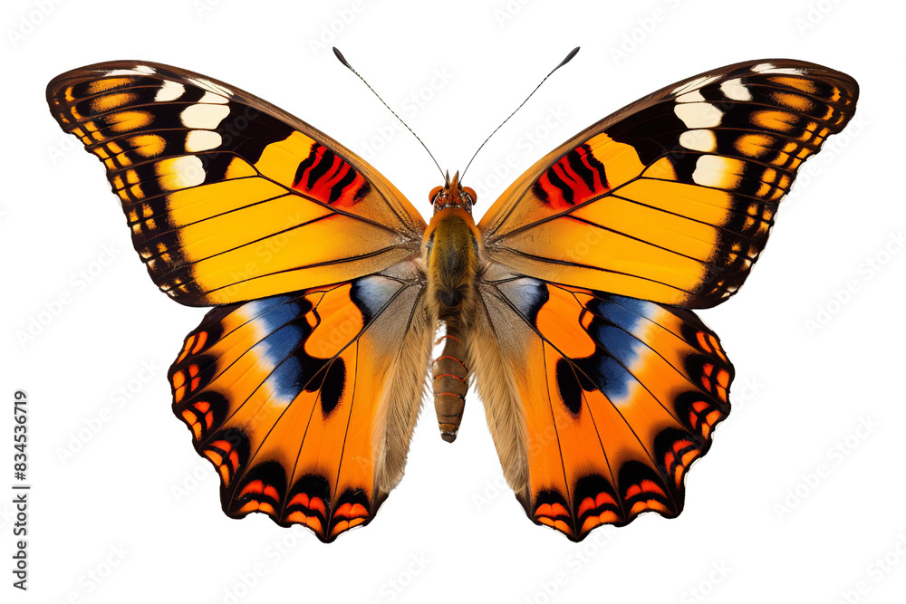 A beautiful butterfly with orange and black wings and white spots on the edges of the wings.