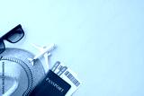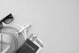 Flat lay composition of summer travel essentials including a hat, passport, airplane model, and sunglasses on a yellow background