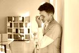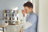 Portrait of stressed male doctor wearing blue uniform and face mask standing in hospital suffering from headache. Young exhausted man physician or nurse tired from hard work in medical clinic.