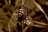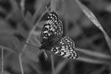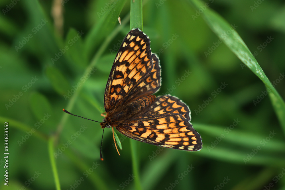 Close-up of orange, white and brown False-heath Fritillary butterfly on a green plant. Melitaea diamina