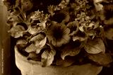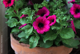 Surfinia plant in a terracotta pot in bloom with beautiful dark pink flowers. Petunia × atkinsiana Surfinia Group