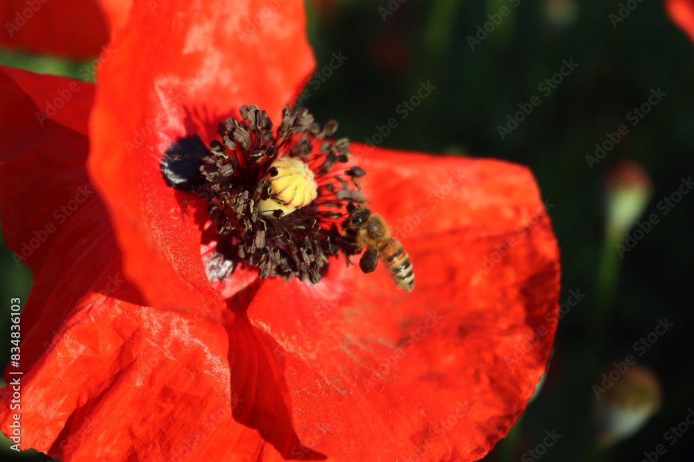 Close-up of honey bee on red Poppy flower. Apis mellifera on Papaver rhoeas in bloom