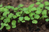 Close-up of fresh roquette or rucola or wild rocket seeding in the vegetable garden on selective focus