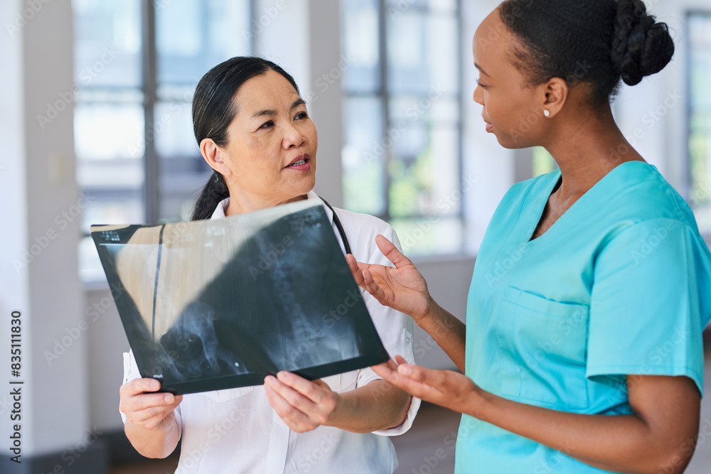 Diverse Medical Team Discussing X-Ray Results in Hospital Setting