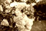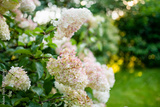 Tender pink flowers of hydrangea arborescens, backlit by the low evening sun in summer. Hortensia flowering in summer garden.