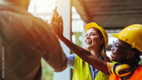 A joyful team of multiethnic construction workers, wearing helmets and safety vests, engages in a celebratory high five at a building site, reflecting teamwork and accomplishment.