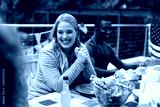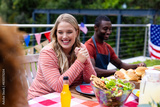 Happy diverse group of friends talking and having dinner at balcony with flags of usa