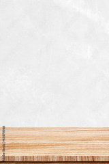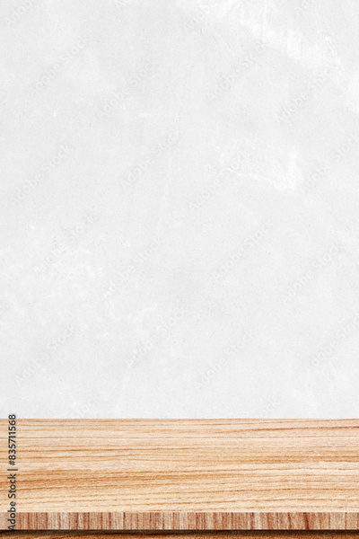 Wood table and white wall background in kitchen, Wooden shelf, counter for food and product display in room background, Wood table top, desk surface banner, mockup, template, vertocal