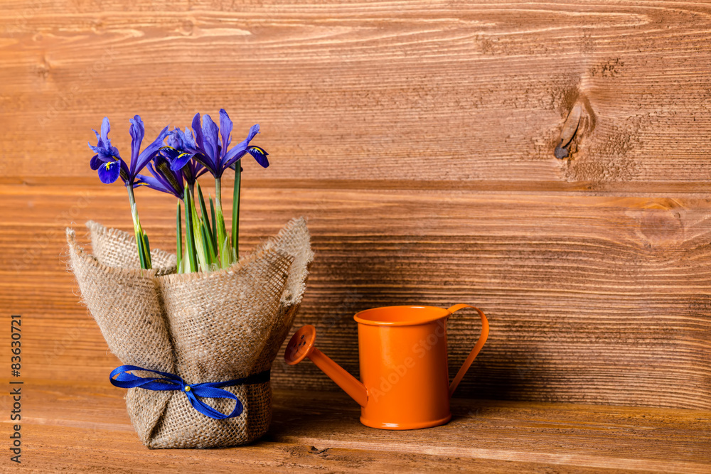iris flowers in burlap and water can on wooden background, close