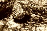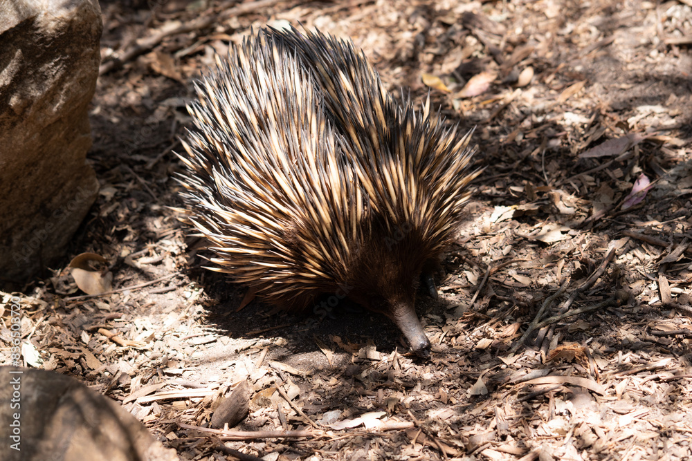the short nosed echidna has strong-clawed feet and spines on the upper part of a brownish body.