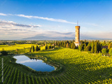 Aerial view of San Martino della Battaglia Tower surrounded of vineyard plantation and lake Garda in the background, San Martino della Battaglia, Lombardy, Italy