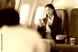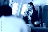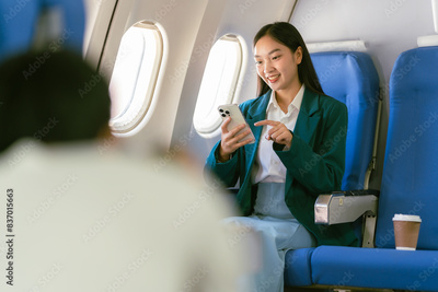 Young Asian woman sitting on a plane and talking on a smartphone sitting in a window seat in economy class using a smart mobile phone during an airplane flight