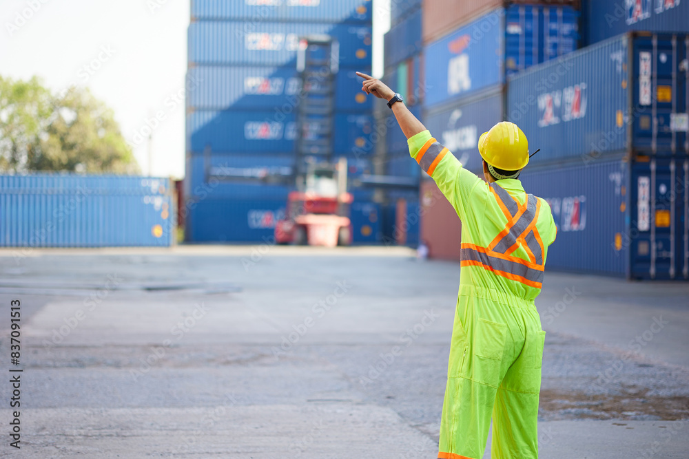back view worker or engineer using walkie talkie and showing gesture to crane car in containers warehouse storage