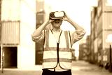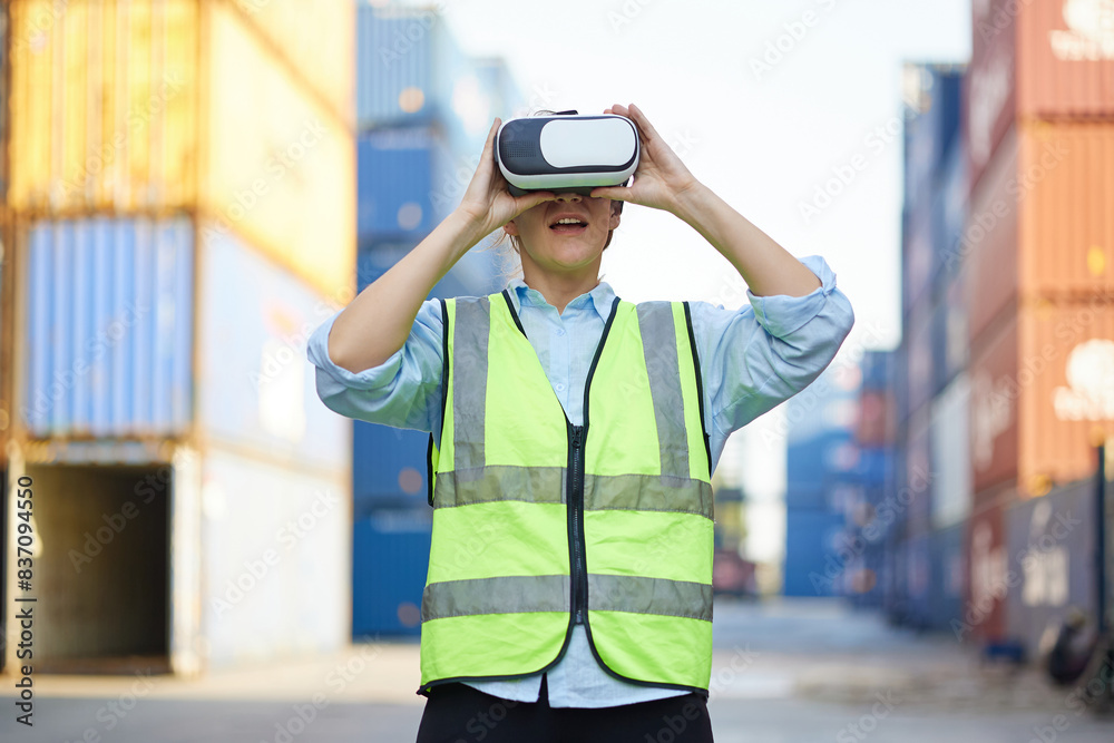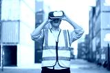 worker or engineer wearing virtual reality glasses(VR) in containers warehouse storage
