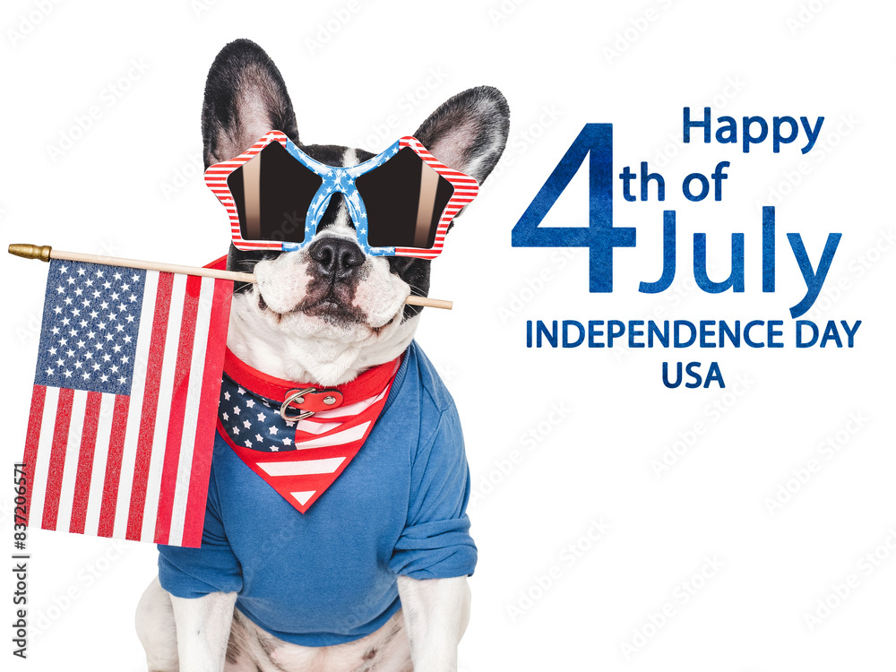 Happy Independence Day. American Flag, cute puppy and congratulatory inscription. Closeup, indoors. Studio shot. Congratulations for family, loved ones, friends and colleagues. Pets care concept