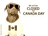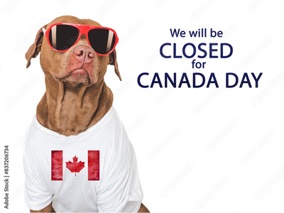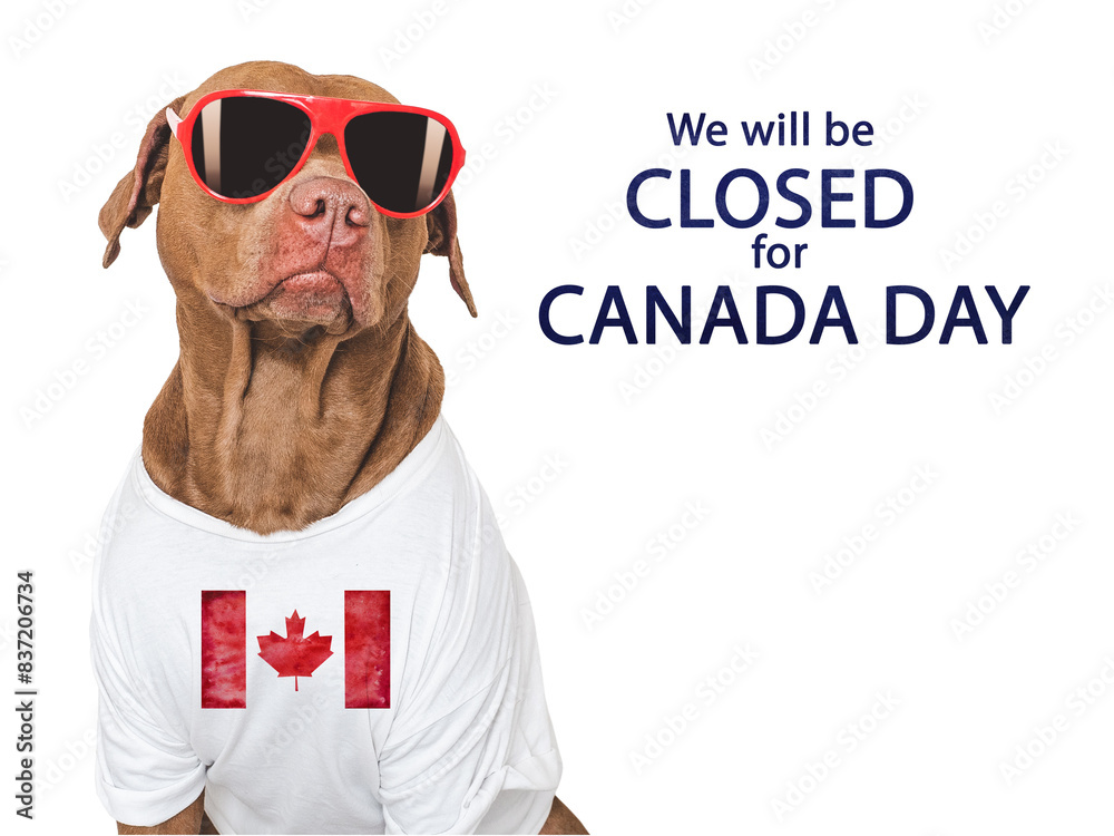 We will be closed for Canada Day. Signboard and a cute dog. Closeup, indoors. Studio shot. Congratulations for family, loved ones, friends and colleagues. Pets care concept
