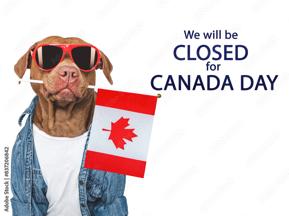 We will be closed for Canada Day. Signboard and a cute dog. Closeup, indoors. Studio shot. Congratulations for family, loved ones, friends and colleagues. Pets care concept