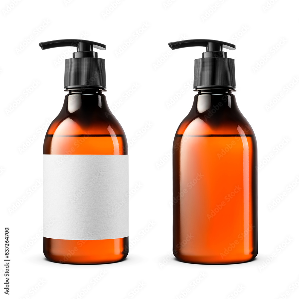 Two amber clean unbranded dispenser bottle for liquid soap isolated. Transparent PNG image.