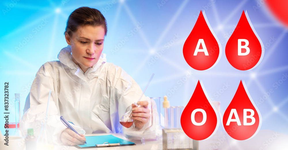 Examination of patient blood. Woman doctor determines blood group. Girl doctor at work. Woman doctor analyzes composition of erythrocytes. Blood group logos near laboratory assistant.