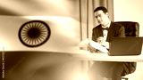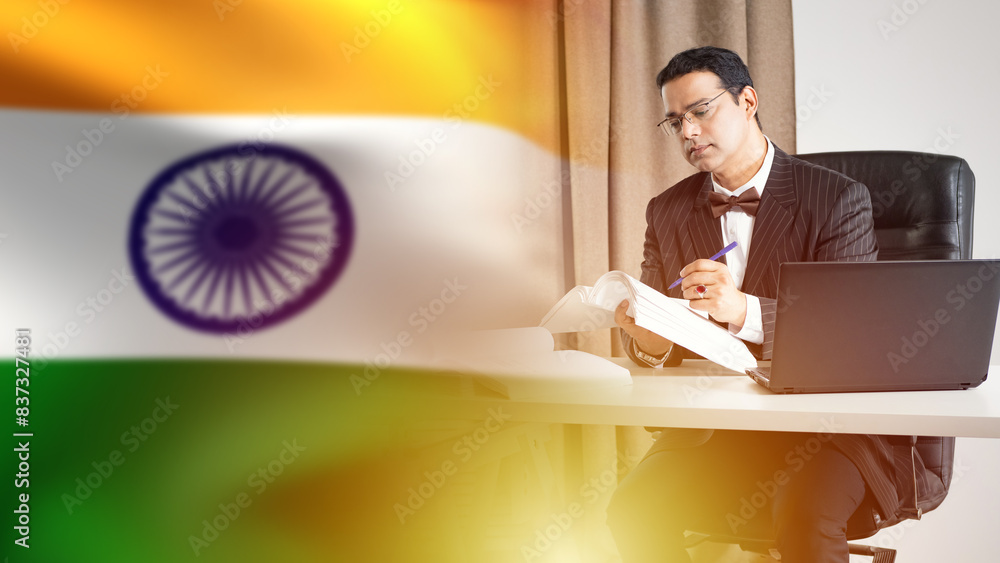 Business man with Indian flag. Manager works while sitting in office. Businessman at work. Indian entrepreneur studies documents. Man lawyer from India. Businessman sits at table with laptop.