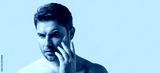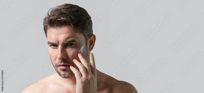 Banner of man with perfect skin touch face after shaving. Skin care healthcare cosmetic procedures concept. Close up man looking in mirror, sensitive skin, cosmetology treatment. Skin care.