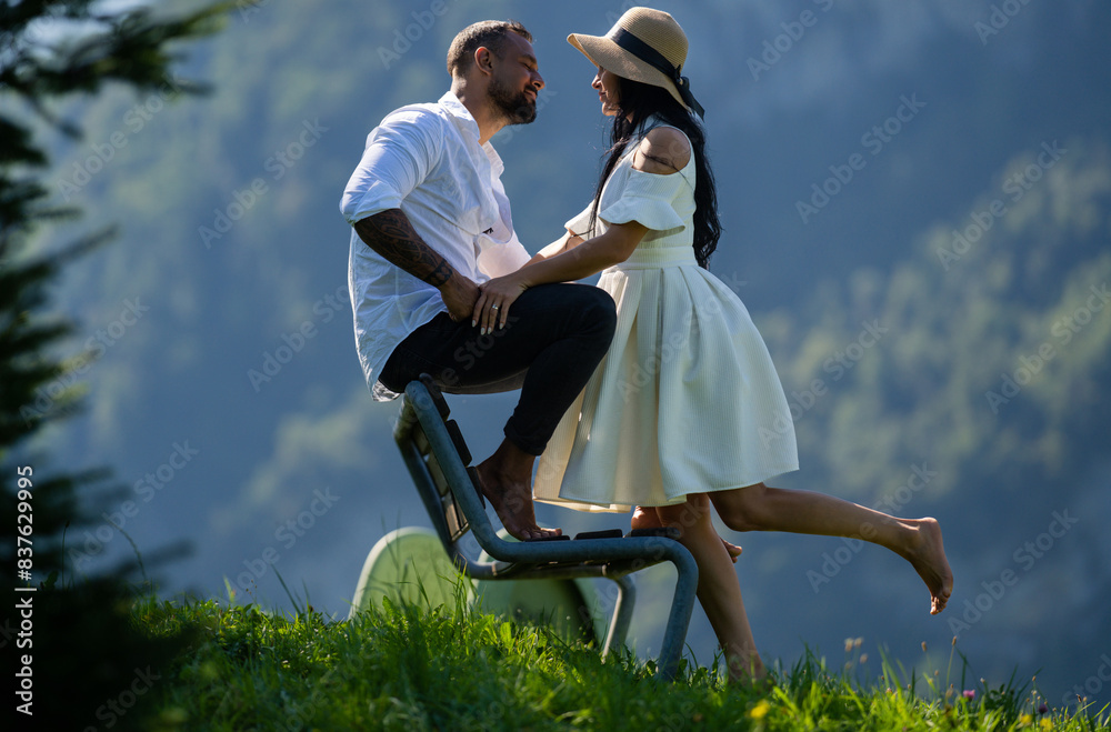 The romantic couple in love on mountain landscape. Happy couple traveler enjoy Alps nature. Two Loving Tourists relaxing at summer mountains nature. Europe travel, trip. Summer vacation concept.