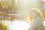 Happy girl sitting in grass at sunset