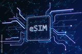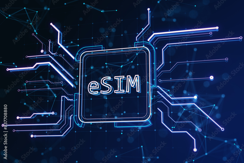 Creative glowing eSim hologram on blurry backdrop. Embedded sim and cellular mobile technology concept. 3D Rendering.