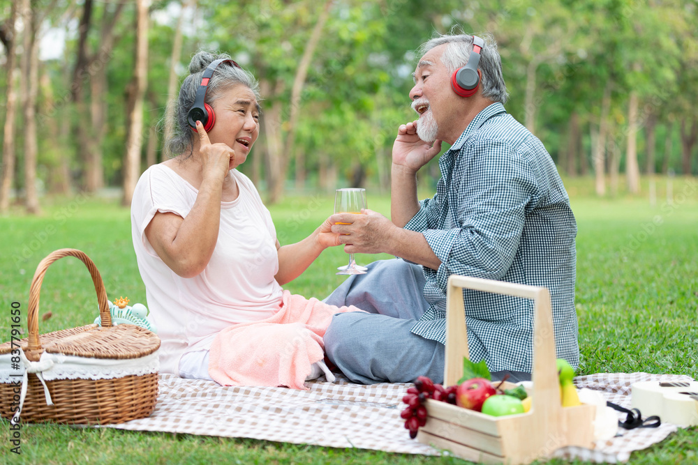 senior couple have a picnic wearing headphone to listen a music and holding orange juice glass in the park