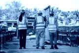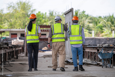 Engineer or foreman worker architecture safety uniform survey at structure building site blueprint and document check detail and tablet of common work is building architecture business concept.