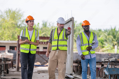 Engineer or foreman worker architecture safety uniform survey at structure building site blueprint and tablet check detail and measure of common work is building architecture business concept.