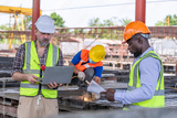 Engineer or foreman worker architecture safety uniform survey at structure building site blueprint and document check detail and measure of common work is building architecture business concept.