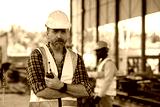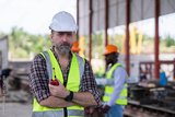 Engineer or foreman worker architecture safety uniform survey at structure building site blueprint and document check detail and measure of common work is building architecture business concept.