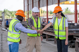 Engineers with foreman worker show hand team cooperated , congratulating successful at work after meeting on construction site teamwork professional architecture concept.