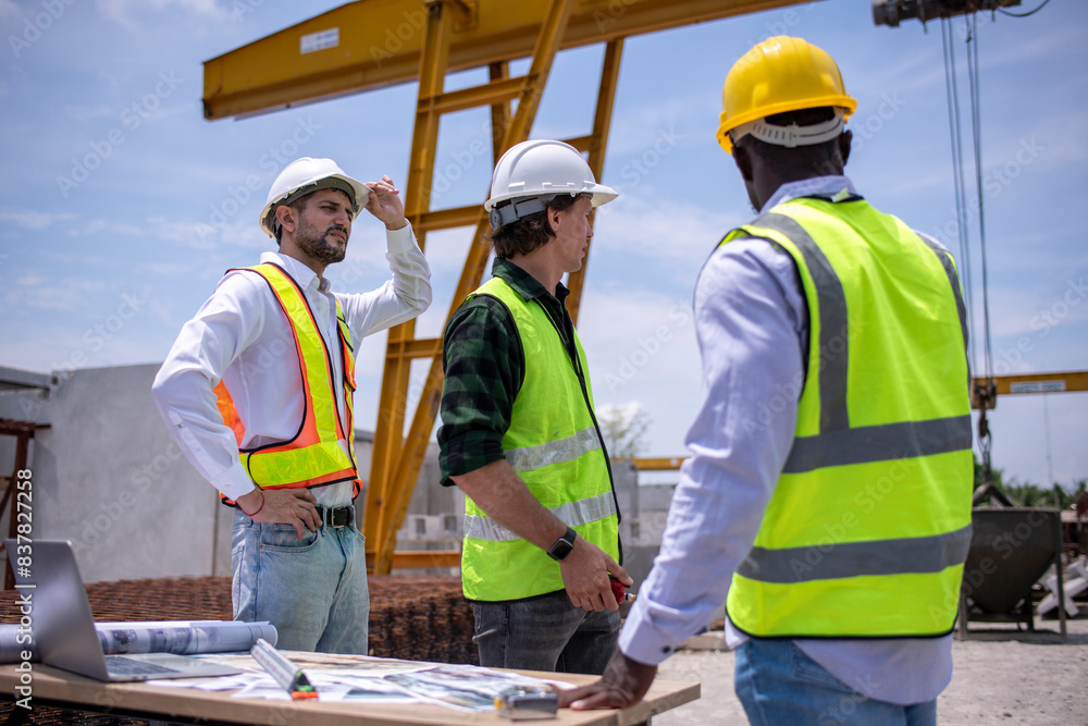 Engineer or foreman worker architecture safety uniform survey at structure building site blueprint and document check detail and measure of common work is building architecture business concept.
