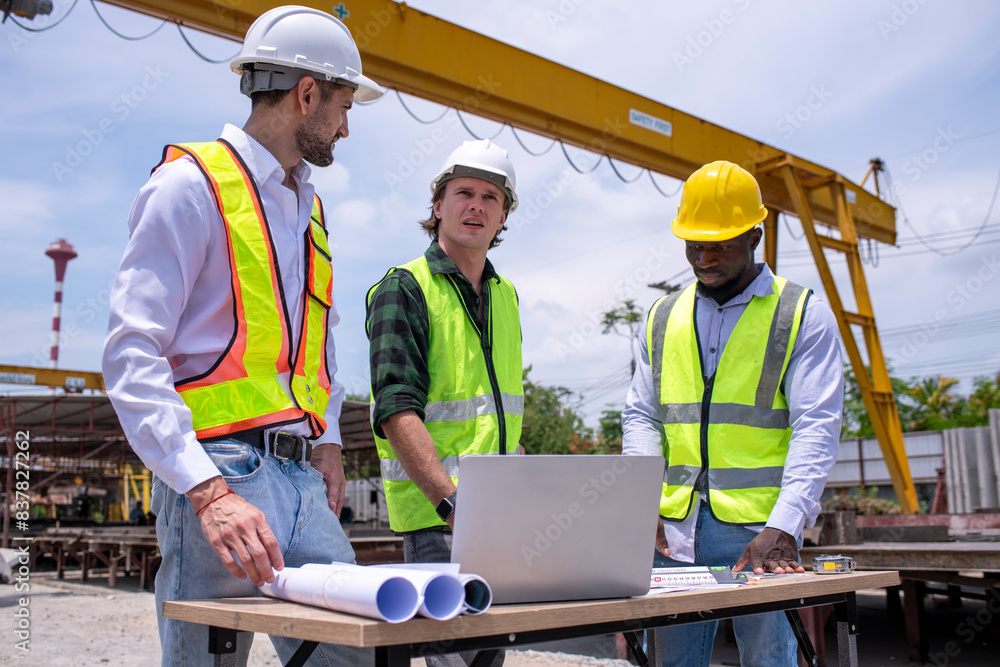 Engineer or foreman worker architecture safety uniform survey at structure building site blueprint and document check detail and measure of common work is building architecture business concept.