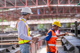 Engineer or worker architecture wearing safety uniform survey and working at structure building site blueprint check detail and measure of common work is building architecture business concept.