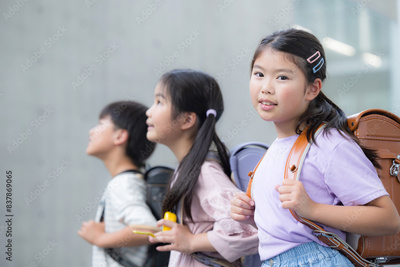ランドセルを背負って見上げる小学生たちとカメラ目線の女の子