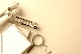 Top view of school supplies including notebook, scissors, and school bus toy on yellow background
