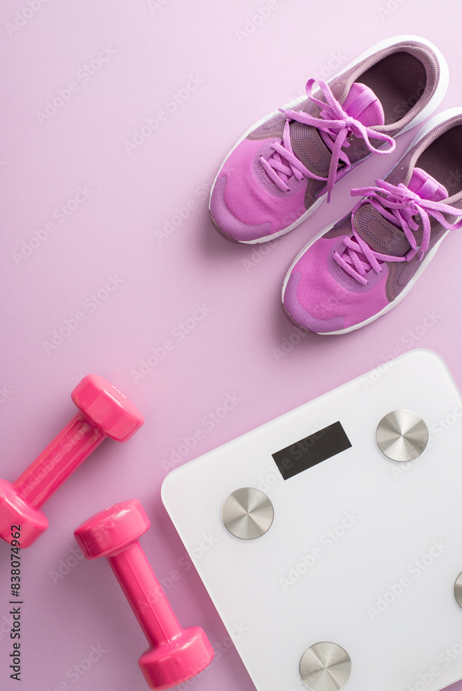 Top vertical view of pink exercise equipment including sneakers, dumbbells, and a digital scale, set on a pink background for fitness and health themes