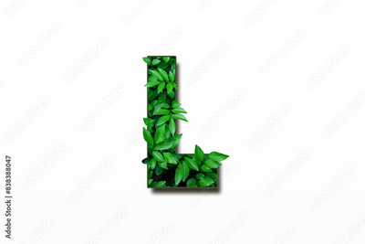 Leaf font L isolated on white background. Leafs font L made of Real alive leaves with Previous paper cut shape of font. Green climate concept.