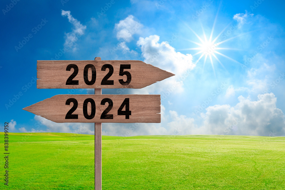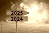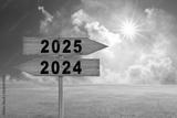 An image with a signpost pointing in two different directions in German. One direction points to 2024, the other points to 2025.