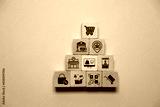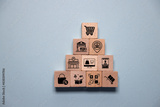 Online shopping or e-commerce concept with online business icons on wooden cubes against white background