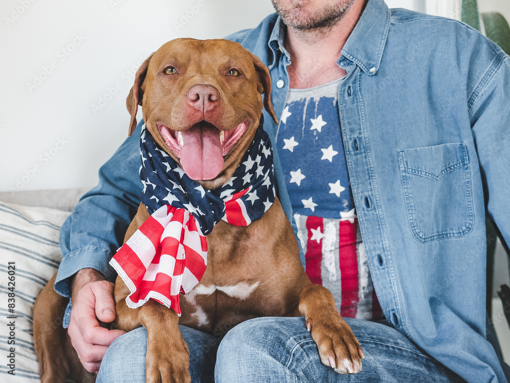 Cute dog, young man and American Flag. Closeup, indoors. Studio shot, day light. Congratulations for family, loved ones, relatives, friends and colleagues. Pets care concept