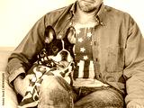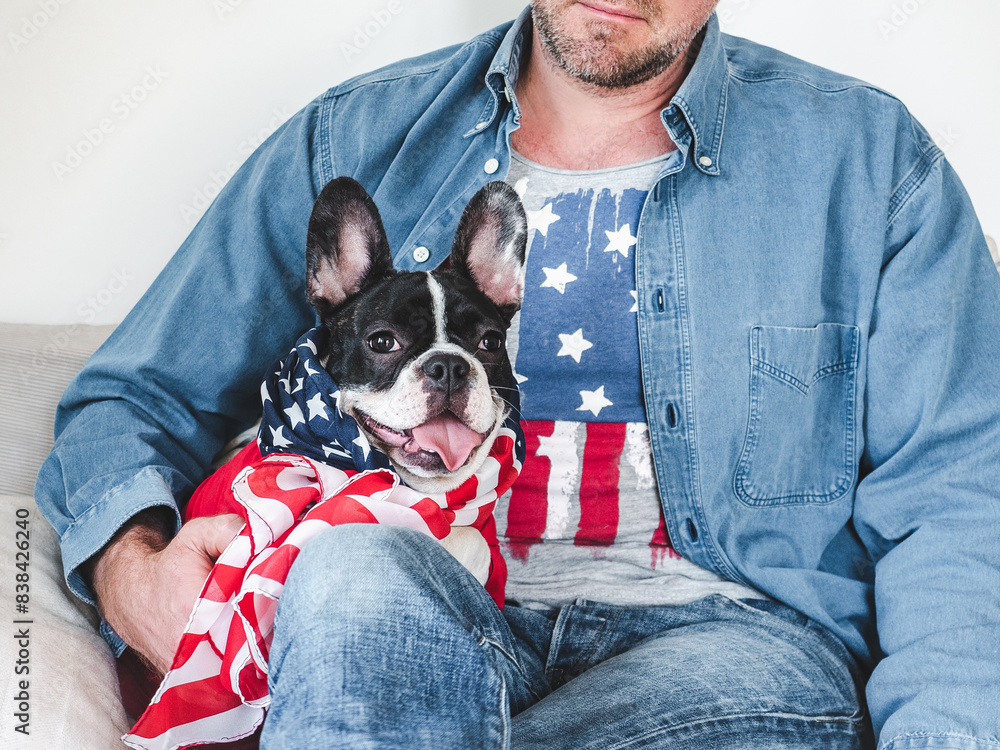 Cute puppy, young man and American Flag. Closeup, indoors. Studio shot, day light. Congratulations for family, loved ones, relatives, friends and colleagues. Pets care concept