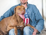 Cute dog, young man and American Flag. Closeup, indoors. Studio shot, day light. Congratulations for family, loved ones, relatives, friends and colleagues. Pets care concept