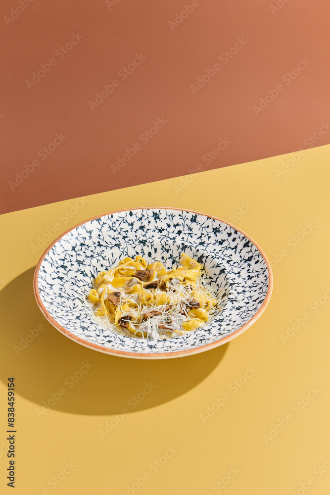Delicious Fettuccine Pasta with Creamy Mushroom Sauce in a Stylish Plate on Colorful Background